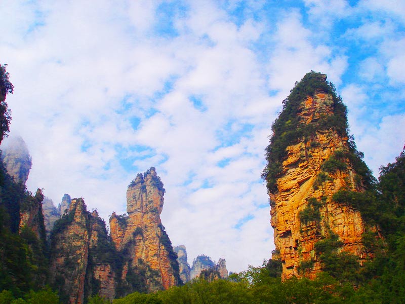 天門山國家森林公園四面絕壁,雄偉壯麗。保存著完整的原始次生林,植物資源豐富,有世界罕見的高山珙桐群落。天門山文化底蘊深厚,留有大量贊詠天門山的詩詞,更有眾多神聞傳說,被譽為“張家界之魂”。山頂天門山寺自唐朝建成以來香火鼎盛,寺外有七級浮屠,掩映于青枝綠葉中,古雅幽清。善男信女入寺拜佛,撞鐘響徹天際,擊鼓震動山岳,香煙裊裊如云。明萬歷年間南岳僧在此傳經(jīng)授戒,從此聞名遐邇,朝山拜佛者達(dá)周邊四郡十余縣,信士遍及湘西北,天門山因此成為 “湘西第一神山”。天門山終年云霧繚繞,云海景象變化無窮。山間溶丘、石芽廣布,奇石秀木及珍禽異獸繁多,更有飛瀑流泉噴涌而出。天門山兼峰、石、泉、溪、云、林于一體,集雄、奇、秀、險、幽于一身,被譽為空中原始花園。天門洞、天縫渡仙、五指山、將軍石等是有名的峰林景觀,還有神秘的千佛洞等待你的探奇;山間的韓家溝則是富蘊滿族風(fēng)情的村落——這里久居的幾十戶滿族農(nóng)家至今仍完好保留著其在語言、飲食、衣著、居住以及婚慶殯葬等方面的滿族風(fēng)俗,是難得的民俗文化旅游地。