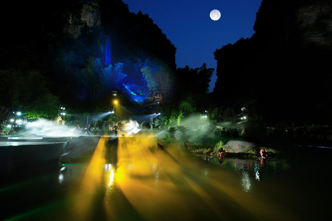 The Ancient Mystical Legend of Zhangjiajie 《武陵魂•梯瑪神歌》是一場記述土家族起源、演變、戰(zhàn)爭、生產(chǎn)生活等內(nèi)容的大型立體山水實景演出,揉合了音樂、舞蹈、文學等多種藝術(shù)形式,如幻如夢的舞美燈光,搖曳生姿的原生態(tài)歌舞……濃縮了土家族數(shù)千年的發(fā)展歷史,400多名演員以自然淳樸的表演充分的展示了土家的民族文化特征,給游客帶來了耳目一新的感受。一場視聽的饕餮盛宴,一曲驚天地、泣鬼神的曠世古歌,給人山水文化光影視聽的享受!境銎罚簭埣医缣莠斏窀栉幕瘋鞑ビ邢薰尽