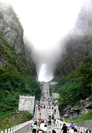 選擇乘索道游覽天門山是最佳視角。索道吊廂一出站房,馬上就騰空飛了起來,從城市的一棟棟樓頂掠過,猶如在城市上空滑翔。翻過一道山梁之后,城市被遠遠拋在了視線以外,大片翠綠的稻田映入眼簾,透過打開的通風(fēng)窗口,一陣陣青草水田特有的清香沁入心脾;蚋呋虻偷霓r(nóng)舍不時從我們身下滑過,牛羊們?nèi)齼蓛捎崎e的在田間浮動著,靜謐、安詳。再翻過一座山峰,我們便立即被滿山的青翠所包圍,萬仞絕壁也已投懷送抱。索道支架矗立于絕壁天險中,或挺立或傾倒或探頭或擁抱,我們繼續(xù)在艱險中游歷,時而隱沒于云堆,時而出世于蒼穹。這時你除了那滿懷的驚險刺激外有的便只有望索而興嘆了。我拍了很多片子,但是總覺得還是沒有足以記錄下來這座空中盆景的壯麗。