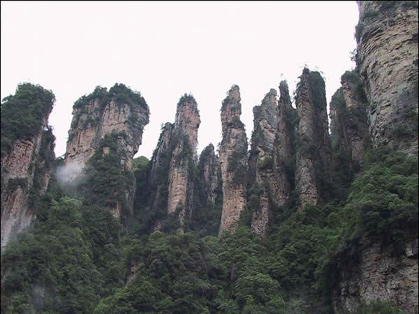 從仙人橋去老屋場,但見深谷里密密麻麻羅列上百座石峰,活像一群威武雄壯的將士列隊聽令,相傳這是向王天子的神兵在聚會。神話雖不可靠,但石峰如此集中壯觀,在武陵源也屬罕見。我想引用一位美術(shù)大師的話:“豈有此理,莫名其妙,說也不信,到此方知”。不看神兵聚會,怎知石峰成林。