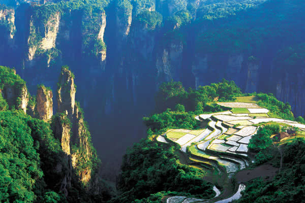 空中田園坐落在天子山莊右側(cè)經(jīng)老虎口、情人路方向兩公里處的土家寨旁,海拔1000余米。它的下面是萬丈深淵的幽 谷,幽谷上有高達數(shù)百米的懸崖峭壁,峭壁上端是一塊有3公頃大的斜坡梯形良田。田園三方峰巒疊翠,林木參天,白云繚繞,活像一幅氣勢磅礴的山水畫。登上“空中田園”。清風(fēng)拂袖,云霧裹身,如臨仙境,使人有青峰鳴翠鳥,高山響流泉,身在田園里,如上彩云間”之感。
