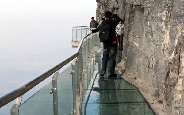 2011年10月1日,張家界天門山國(guó)家森林公園新建的玻璃棧道正式對(duì)游客開放。玻璃棧道懸于天門山頂西線,長(zhǎng)60米,最高處海拔1430米。是張家界天門山景區(qū)繼懸于峭壁之上的鬼谷棧道、憑空伸出的玻璃眺望臺(tái)、從玻璃臺(tái)可以看見下面。玻璃臺(tái)伸出棧道有4-5米,專供游人拍照、橫跨峽谷的木質(zhì)吊橋后打造的又一試膽力作。為了讓游客零瑕疵的透過玻璃橋看到美麗的風(fēng)景,上橋的游客均要求戴上鞋套,以保持玻璃橋的透明和干凈。玻璃棧道的刺激震撼,可與舉世聞名的美國(guó)大峽谷玻璃走廊“天空之路”媲美,因而有了東方“天空之路”的美譽(yù)。