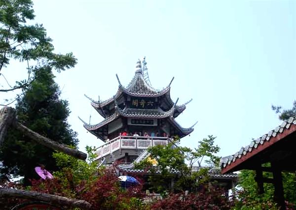 六奇閣位于張家界森林公園黃石寨項的人工建筑。因張家界國家森林公園”山奇、水奇、云奇、石奇.樹奇以及珍禽異獸之奇”而得名。閣分3層,黃瓦蓋頂,飛檐翹角,畫梁彩棟,回廊石欄。登閣憑眺,滿目佳景。閣柱楹聯(lián)日:“翠鬟煙籠,綠樹云封.昔日曾遮半個面:麗質(zhì)天生,畫圖省識,今朝始醉四方人!庇忠宦(lián)云“名動全球,到此實堪三擊掌:勢拔五岳,歸來不用再看山。”閣內(nèi)設(shè)有土家風(fēng)情歌舞樓.竟日絲竹弦管,清音繞梁。閣基嵌有《張家界國家森林公園記》全文碑刻。1995年9月8日.全國政協(xié)主席李瑞環(huán)登閣賞景。