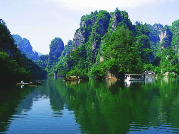 寶峰湖瀑布 湖中有兩座疊翠小島,近岸奇峰屹立,峰回水轉(zhuǎn)。泛舟漫游,只見一湖綠水半湖倒影,充滿詩情畫意!霸铺萑f丈上天臺,高峽平湖一鑒開,王母瑤池金扶,浣沙仙女下凡來”游寶峰湖,你就會欣賞到這樣的詩情畫意。群峰擁抱的寶峰湖,長約2.,5公里,湖猶如一面寶鏡,四面青山,一泓碧水,蕩槳溫游,格外愜意。坐在船上,環(huán)顧四周,千山聳翠,俯視水中,倒影慢移,碧水照相館得群峰綠,人面桃花水映紅。真是靜極了,美極了!韓劇《九天洞》拍攝的湖水就是寶峰湖。