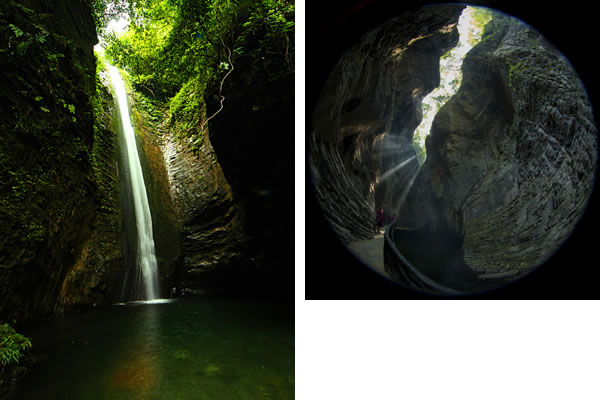 西線(xiàn)原名叫雪花溪,又叫雪花洞,水從懸崖上掉下來(lái)濺起水花,泉水與巖石相碰,落成大霧,形成雪花狀,故名雪花溪。因地勢(shì)險(xiǎn)峻,歷代人都沒(méi)有把雪花溪走通過(guò),從下往上看深不見(jiàn)底,古人以為是一個(gè)洞,故又叫雪花洞,其實(shí)是一個(gè)峽谷,有七潭七瀑,現(xiàn)在叫“仙女峽谷”。峽谷長(zhǎng)800米,最窄處僅1米左右,上下落差近200米,因水的長(zhǎng)期回旋沖刷, 巖層的堅(jiān)硬度各異,形成了底寬頂窄,時(shí)北,時(shí)西,時(shí)東,陰暗無(wú)光,形似溶洞, 泉水飛流直下,形成梯級(jí)瀑布,擊打在巖壁上濺起的水花猶如雪花飛舞,潭中一片雪白,古人稱(chēng)之為雪花洞,峽谷中有七個(gè)各異的潭池在沖擊的水花中若隱若現(xiàn),故改稱(chēng)為七仙女人間沐浴瑤池,從開(kāi)天辟地起無(wú)人行通過(guò),現(xiàn)在已修好的占道,于峽谷水花之中,幻入仙境之感。