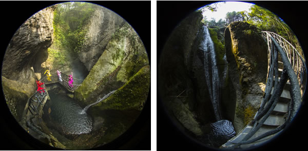 走在吊橋中間,必須保持自身的平衡方能安全通過(guò),不然就會(huì)在吊橋上搖擺不定。走出仙女峽谷,往下看,深不見(jiàn)底,七潭七瀑在奇險(xiǎn)之中不乏壯觀(guān),這里曾發(fā)生過(guò)跳潭救女的故事。