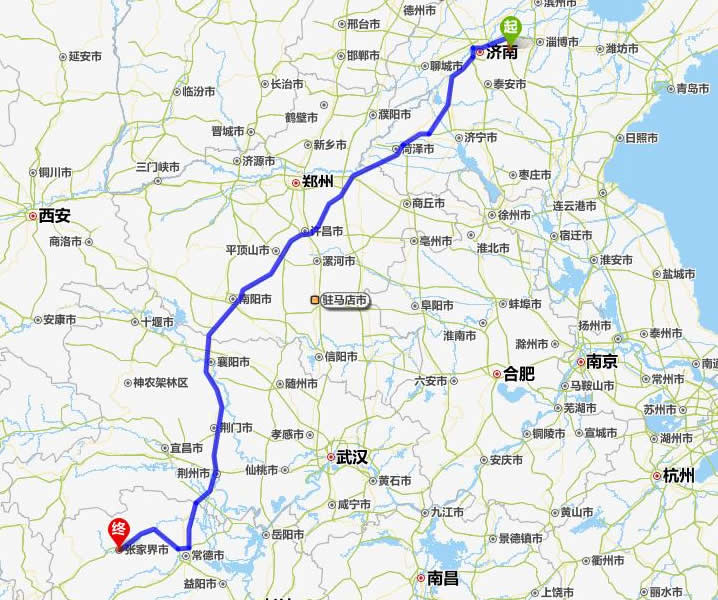 左右,沿途經過章丘——濟南——菏澤市——蘭考縣——許昌市——平頂山——南陽——襄陽——荊門——荊州——常德(也可以走國道經澧縣、石門縣)——慈利——張家界。