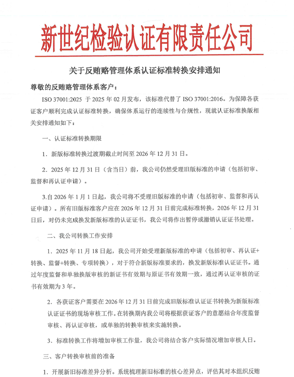 3.自2026年1月1日起,我公司將不受理舊版標(biāo)準(zhǔn)的申請(包括初審、監(jiān)督和再認證申請)。所有舊版標(biāo)準(zhǔn)客戶應(yīng)在2026年12月31日前完成標(biāo)準(zhǔn)轉(zhuǎn)換,2026年12月31日后,對仍未完成換發(fā)新版標(biāo)準(zhǔn)的認證證書,我公司將作出暫?;虺蜂N認證證書處理。